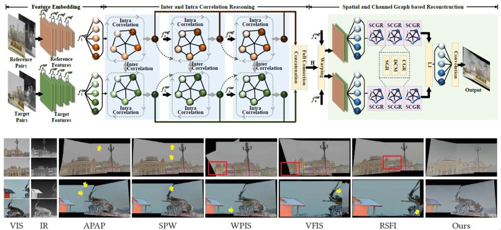 研究成果“Multi-Spectral Image Stitching via Spatial Graph Reasoning”由博士研究生姜智颖、硕士研究生张曾翕、刘晋源博士、樊鑫教授和刘日升教授(通讯作者)合作完成。此项研究首次提出了一种基于空间图推理的多光谱图像拼接方法,利用图卷积网络(GCN)在建模特征关系方面的优势有效实现不同视角下多光谱图像的变形和融合。该项研究还提出了一个大视差多光谱图像拼接数据集ChaMS,为该任务的性能评估提供了新的选择。该工作代码已开源:https://github.com/Jzy2017/SGR-MSIS。