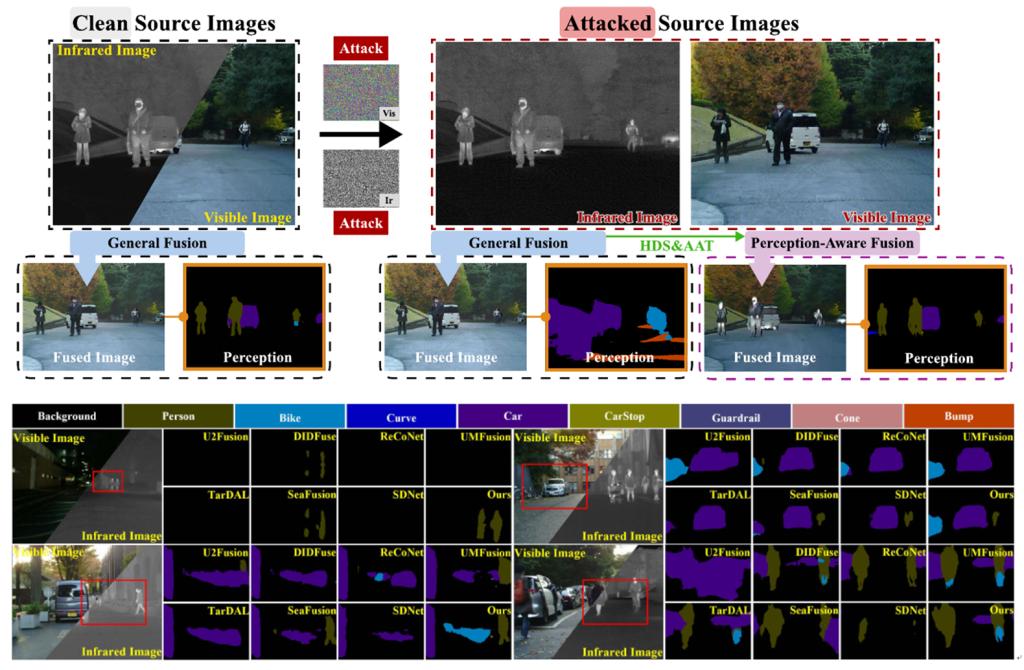 研究成果“PAIF: Perception-Aware Infrared-Visible Image Fusion for Attack-Tolerant Semantic Segmentation”由博士研究生刘铸、刘晋源博士、硕士研究生张本壮、马龙博士、樊鑫教授与刘日升教授(通讯作者)共同合作完成。此项研究提出了一种面向语义感知的红外可见光融合方法,用来提高在对抗攻击场景下的鲁棒性。通过鲁棒网络结构搜索与自适应学习策略从网络结构与参数学习两方面综合设计解决方案,实现语义分割性能15.3%的显著提升。代码链接https://github.com/LiuZhu-CV/PAIF。