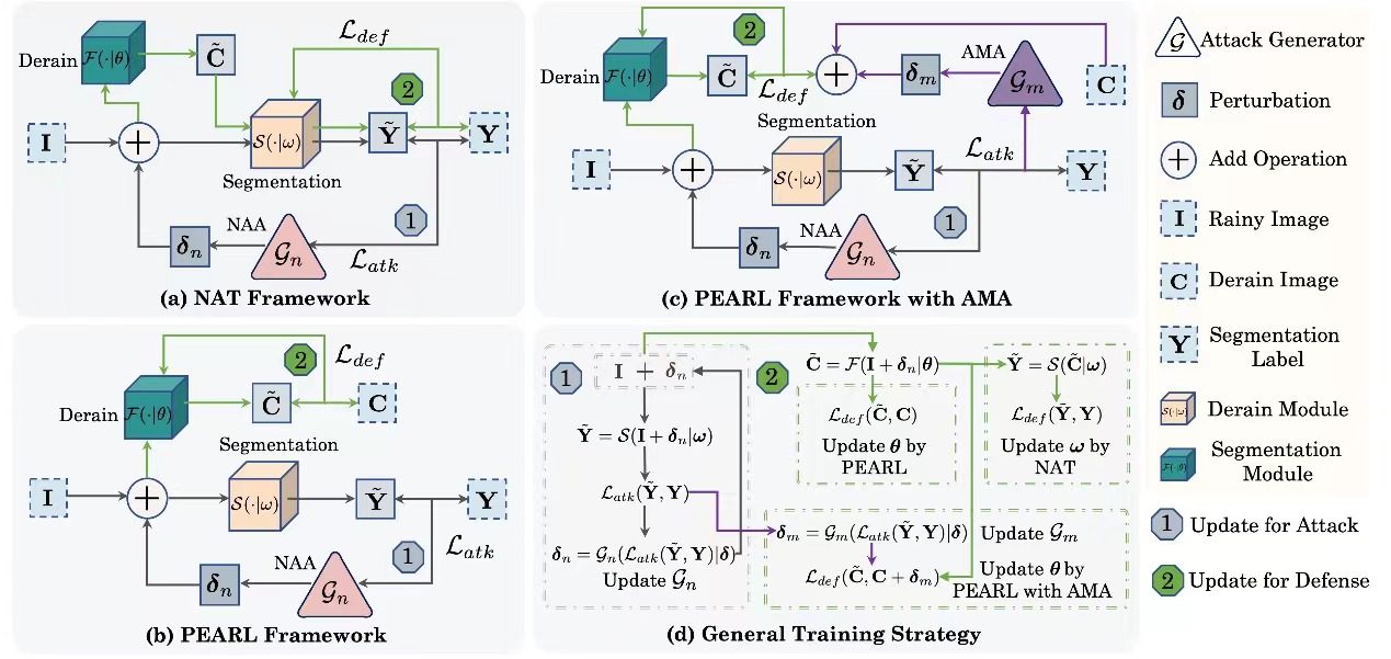 研究成果“PEARL: Preprocessing Enhanced Adversarial Robust Learning of Image Deraining for Semantic Segmentation”由硕士研究生焦翔昊、博士研究生刘耀华、博士研究生高嘉馨、硕士研究生褚鑫源、樊鑫教授、刘日升教授(通讯作者)共同合作完成。此项研究首次尝试同时处理针对语义分割任务的自然因素(如雨线)、人为因素(如对抗攻击)不同类型降质因素,提出了预处理增强对抗鲁棒学习训练框架框架,提升了分割模型在真实恶劣场景下的性能鲁棒性。代码已开源在https://github.com/JiaoXianghao/PEARL。