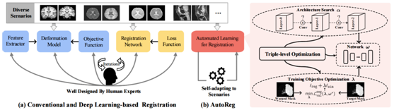 据了解,可变形配准是医学影像分析,如手术导航、肿瘤定位、器官分割等必不可少的关键技术。无论是从传统的能量优化方法还是深度学习方法中衍生出的成功配准算法,都需要计算机专家投入大量精力,设计网络架构,设置调整超参数等。