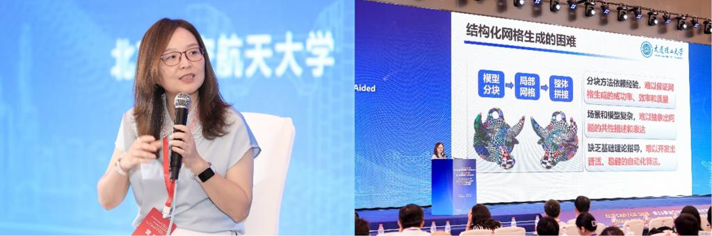 雷娜教授组织了“CAD/CAE/CAM中的几何问题”专题论坛,并以“结构化网格自动生成的现代几何理论”为题,分享了团队在结构化网格自动生成方面的研究成果,引领与会者深入探讨这一领域的创新思路。雷娜教授同时主持了报告之后的专家讨论会环节,回答了与会者关于网格方面的问题,为学术交流提供了更新的视角与思路。