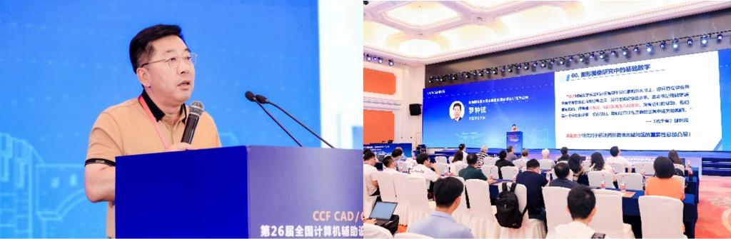 会议期间,大连理工大学代表们积极参与学术交流,展示了他们在几何设计与计算领域重要的研究成果。罗钟铉副校长在“战略论坛”上,做了题为“面向国家重大需求的图形图像理论研究与应用”的精彩报告,他详细介绍了大连理工大学在结构化网格和水下图像识别等国家重点应用方面的研究进展,深入探讨了图形图像理论在满足国家重大需求方面的应用前景,引发了与会者的广泛共识。