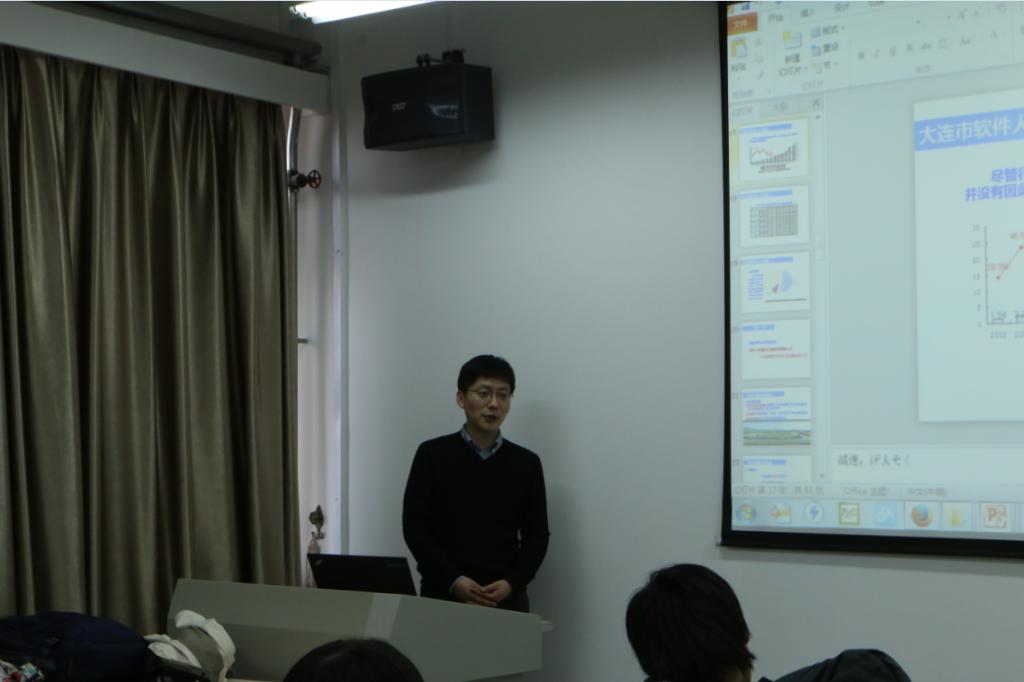 日方学生参观了校区及学院教学设施后,大连理工大学软件学院软件工程系主任孔维强教授在C506教室给学生做了“关于软件行业发展现状”的讲座。孔维强教授介绍了软件行业,尤其是大连软件行业软件架构,以及人才缺口情况;并向大家介绍了软件学院人才培养,学科建设与科研等情况。