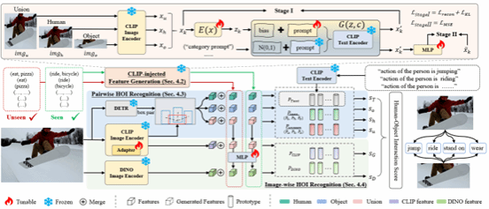 研究成果“Unseen No More: Unlocking the Potential of CLIP for Generative Zero-shot HOI Detection”由郭益鑫博士研究生、刘宇副教授(通讯作者)、李江浩硕士研究生、王维民副教授和贾棋副教授共同合作完成。此项研究针对目前零样本人物交互检测领域在测试期间出现可见类别与不可见类别混淆的问题,创新地提出了一种通过CLIP注入特征生成器生成特征进行零样本人物交互检测的方法HOIGen。与此同时,还引入多知识原型库来增强人物交互得分,解决了现有方法在零样本人物交互检测上的核心挑战,并在多种零样本设置下达到了卓越的性能。该相关工作已开源至https://github.com/soberguo/HOIGen。
