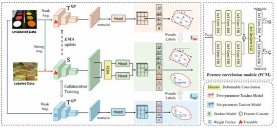 研究成果“Two Teachers are Better Than One: Semi-supervised Elliptical Object Detection by Dual-Teacher Collaborative Guidance” 由刘宇副教授、冯龙晗硕士研究生、贾棋副教授(通讯作者)和刘泽正硕士研究生共同合作完成。此研究考虑到现有方法在参数配置上的困难,提出了一种面向标签稀疏场景下的师生半监督学习框架——双教师协作指导。通过使用特征交互模块和协同训练策略以互补的方式指导学生的训练。该相关工作已开源至https://github.com/FengLongHan/DTCG。