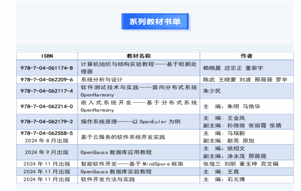 近日,示范性软件学院联盟公布了软件工程系列首批试点应用教材,我院《计算机组织与结构实验教程-基于鲲鹏处理器》《嵌入式系统开发-基于分布式系统OpenHarmony》《基于云服务的软件系统开发实践》三本教材成功入选!此次入选,既是我院推进高校软件工程专业一流课程与教材建设的成果,也是进一步解决我国软件工程专业核心教材缺乏基于自主创新的软件系统的教材体系问题、推动国产自主软件技术和软件工具进课堂、创新产教融合模式、助力特色化软件学院建设、培养高质量软件人才所取得的标志性成果。