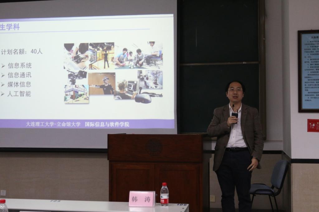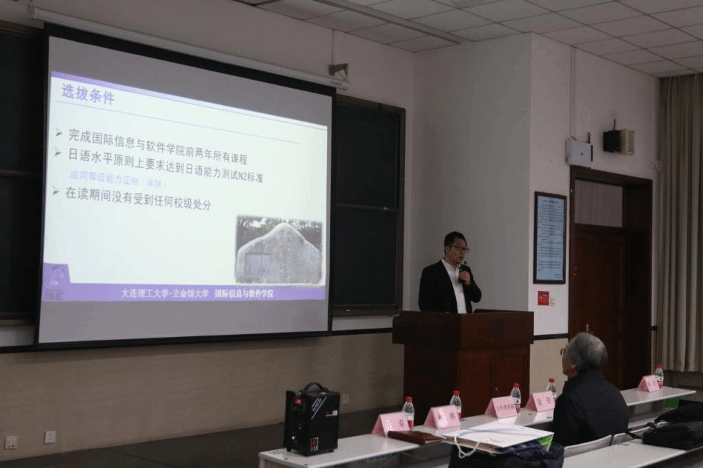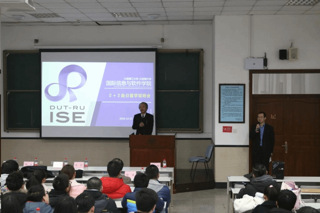 2016年12月21日下午3点,面向2015级软国学生的2+2赴日留学宣讲会在大连理工大学开发区校区教学楼B203顺利举行。本次宣讲会由国际信息与软件学院中方院长助理林林副教授主持,国际信息与软件学院日方院长大久保英嗣教授、立命馆大学信息理工学院办公室副主任吴岩老师、国际信息与软件学院徐睿老师等出席了本次宣讲会。