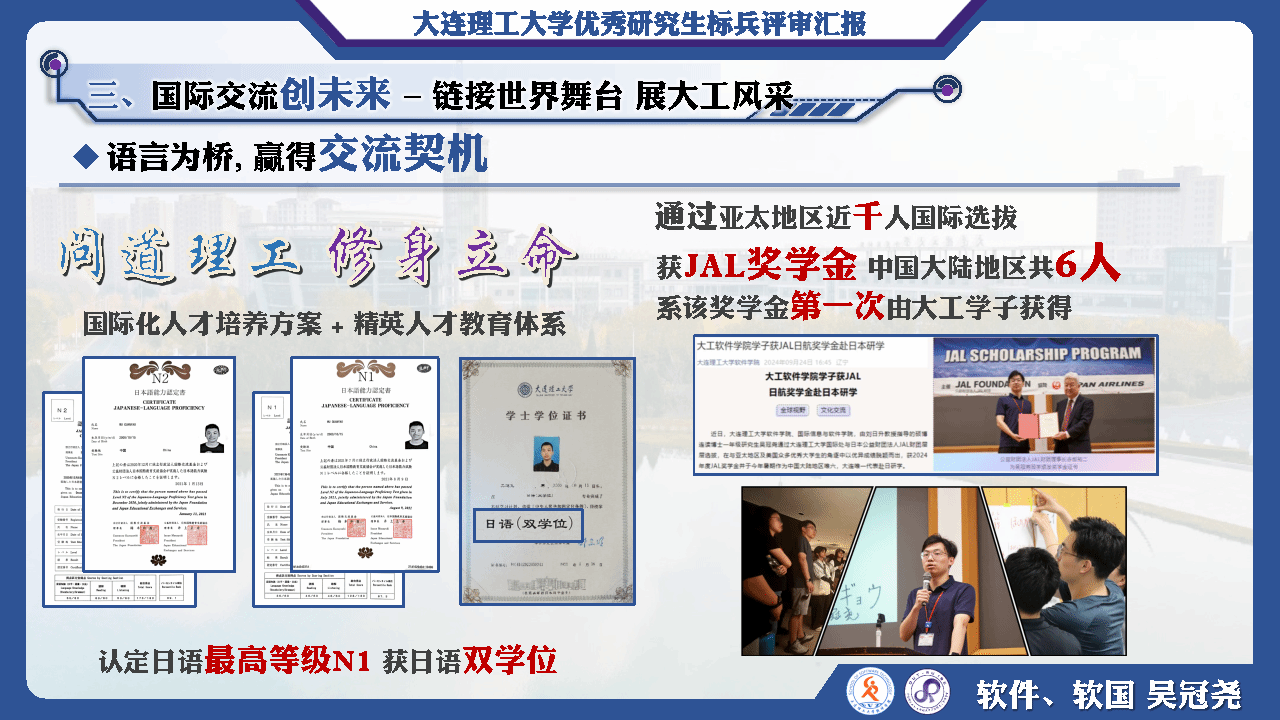 遵循学院国际化人才培养方案及指导方针,他将语言作为面向世界的交流手段深入学习,认定日语最高等级N1并获日语双学位。以此为契机在今年通过亚太地区近千人的国际选拔获得JAL奖学金。