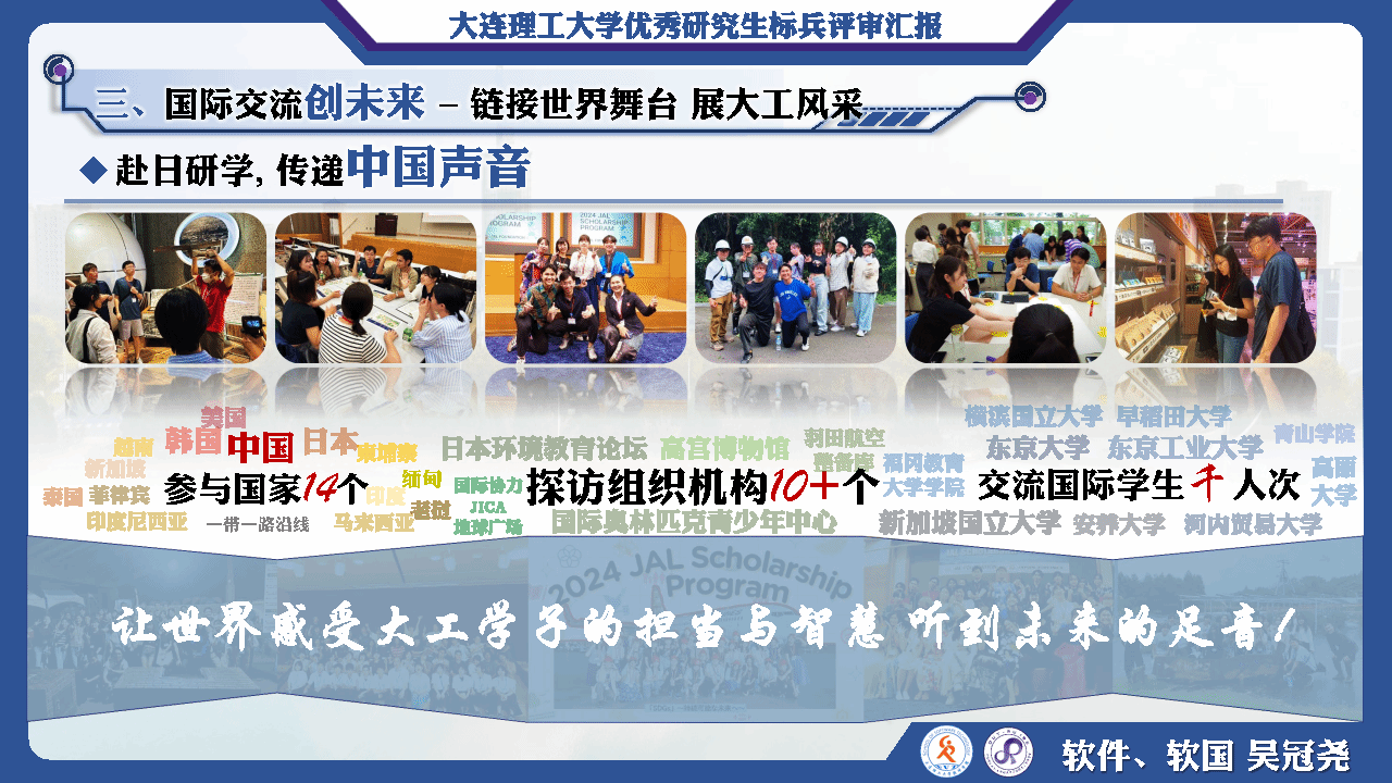 他获得日方全额资助赴日研学,期间他积极参与各项活动,探访十余个国际组织机构并交流国际学生千余人。在世界舞台上展现大工学子担当与智慧,传递中国声音。