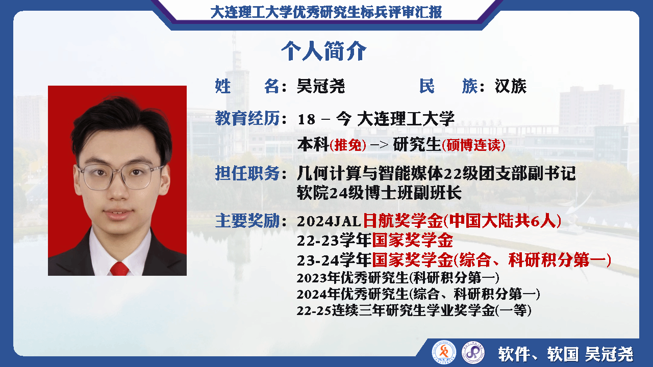 这是吴冠尧同学的奋斗与成长之路!标兵荣誉是对他的肯定、也是他未来前进路上的一大动力。现今,他以硕博连读身份转入博士培养阶段、以新的身份继续启程。他希望可以发挥更大的光与热,为大工和祖国做出更多的贡献,向着更广阔高远的世界攀登。
