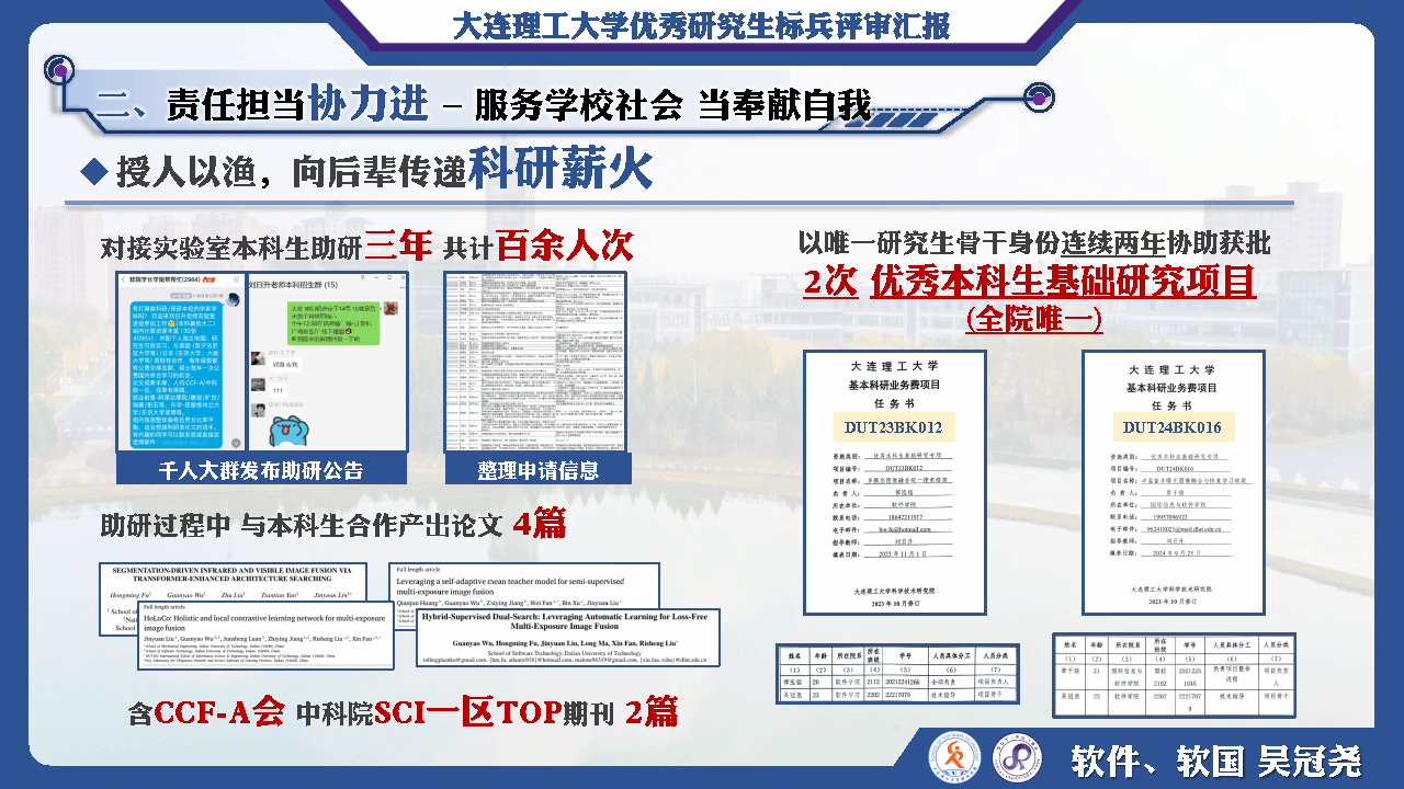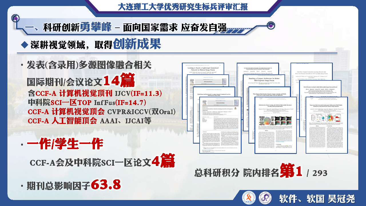 面向国家在无人系统感知方向的难题,他深耕多源图像融合领域,取得一定创新成果。发表(含录用)多源图像融合相关,国际期刊会议论文共14篇,含CCF-A 类计算机视觉顶刊IJCV、计算机视觉顶会CVPR、ICCV、人工智能顶会AAAI、IJCAI及SCI一区TOP期刊等,期刊总影响因子63.8,谷歌学术引用超700余次。在国际学术舞台展示了软件工程学子的影响力。