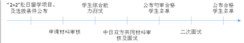 具体选拔条件及流程如上图所示:通过综合能力测试,对学生的基础知识运用、问题的分析(识别、表达、获得有效结论)能力及设计/开发解决方案的设计能力进行考核。经材料审核及面试小组考核,了解学生的日语能力、交流能力、“2+2”赴日留学申请动机、个人未来发展规划、知识学识及申报信息的真实性。联合管理委员会代表进行二次面试并确定最终“2+2”赴日留学申请合格学生名单。