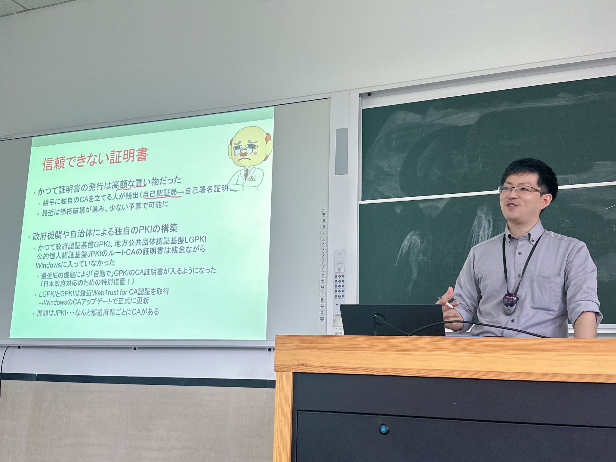 吉田政望助教则以其独特的视角和深入的研究,为学生们带来了关于密码学的精彩讲解。他详细解释了流密码、块密码等加密技术的基本原理和应用,并重点介绍了公钥密码学和电子签名等前沿技术。他的讲解既严谨又生动,让学生们对密码学这一复杂的领域有了更为清晰的认识。