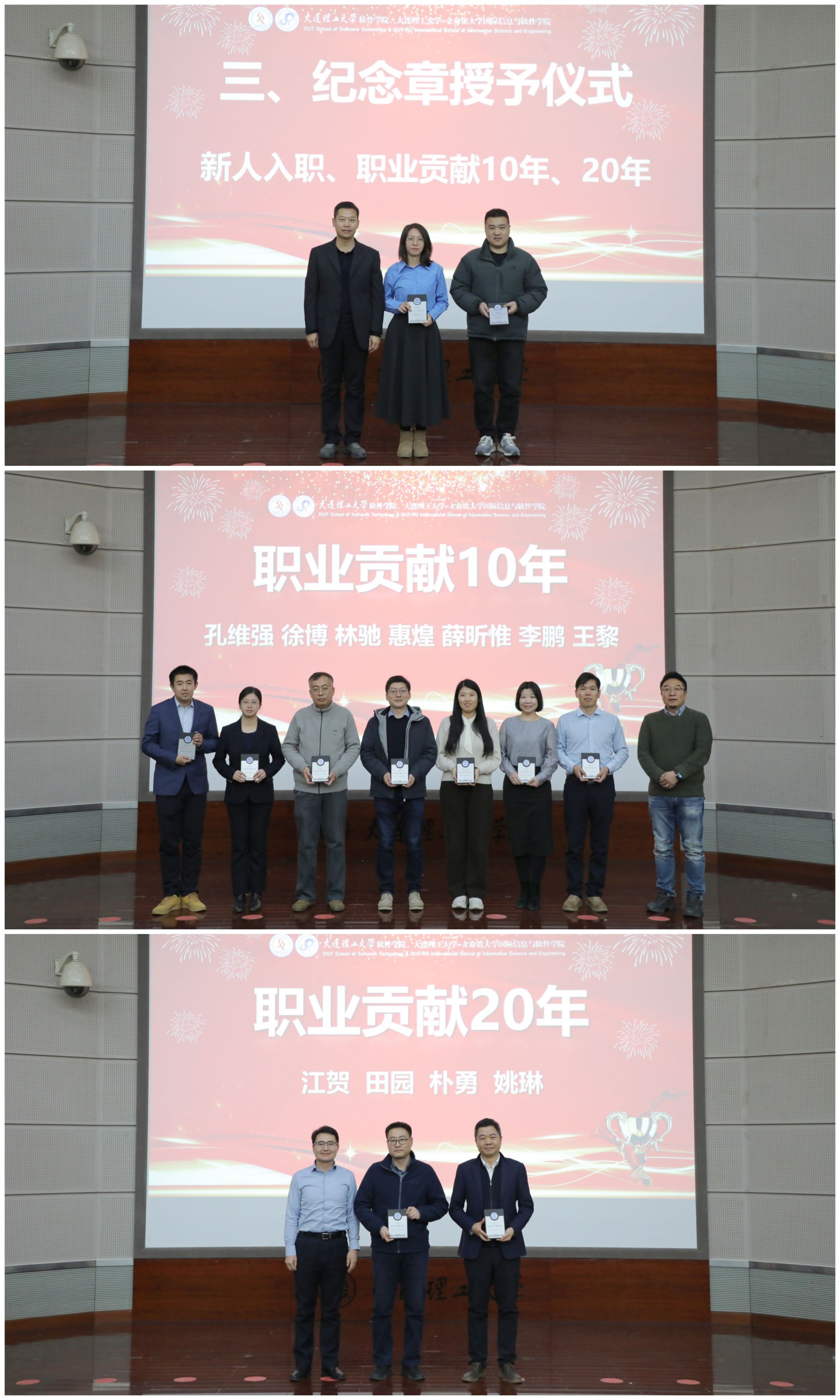 为了鼓励新人、表彰职业贡献,会上还举行了新人入职、职业贡献10年、20年纪念章授予仪式,樊鑫、林林、辛永亮分别为相关教师颁发了纪念章。