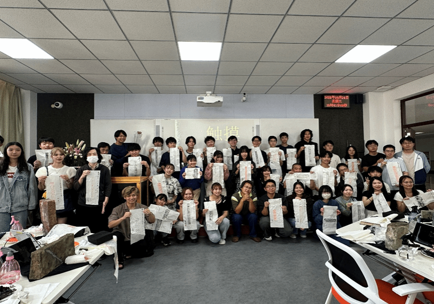 学院为代表团精心安排了拓印体验。“拓印,是中国最古老的‘复印术’,也是留住文明指纹的方式。拓印课上。墨香四溢,日本学生跃跃欲试,上纸、润墨、扑拓、揭取,一板一眼,将古老的汉字与图案一一拓印于纸上。一个半小时的体验,每位代表团成员都完成了一副作品。动手体验的震撼远超课堂讲授,大家完成的不只是拓片,更是对中华文化深层价值的认同。