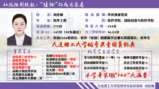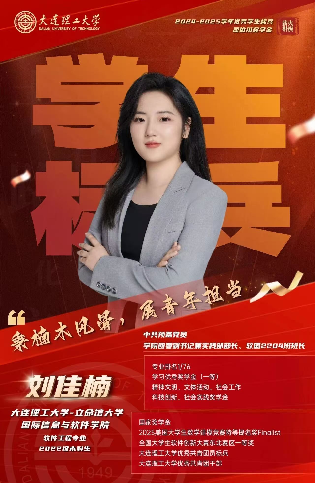 刘佳楠,女,2022级软件工程专业本科生,中共预备党员,大三学年加权均分 96.05,连续三学年学业排名第一、综合排名第一,任软国2204班班长、学院团委副书记兼实践部负责人,三年来获国家奖学金等18项奖学金、获评“大连理工大学优秀学生标兵”、“大连理工大学优秀共青团员标兵”、“大连理工大学优秀三好学生”等荣誉。她如楠木般坚毅不拔,书写着“佳楠”从扎根到绽放的成长答卷。