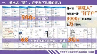 自入学以来,刘佳楠便认真学习,刻苦勤奋。从早上八点红日初升,到夜晚十点月上枝头,开发区图书馆的84号座位是比寝室更熟悉的一方天地。500余条预约记录,68本学习笔记,千余个单词,万余行代码,都见证了她日复一日的坚持。