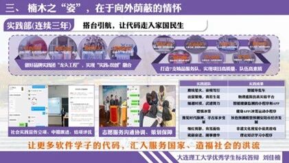 任学院团委副书记兼实践部部长,打造7支精品服务队,探索培育“科技兴国”等具有软件专业特色的实践团队。任职期间团队数量较上年增长近40支,指导26支团队获校级奖项——她想让更多软件软国学子的代码,汇入服务国家、造福社会的洪流。