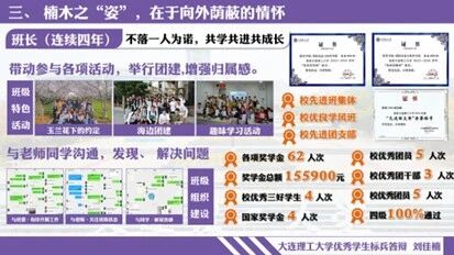 她连续四年担任班长,助力班级全面发展。三年来,班级获各项奖学金62人次,其中国家奖学金4人次,总金额超15万元。获评“先进班集体”、“优良学风班”、“先进团支部”。