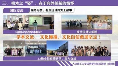 她担任志愿者参与国际化项目、接待国外访问团。作为软国学子,她努力讲好大工故事,传播中国文化。
