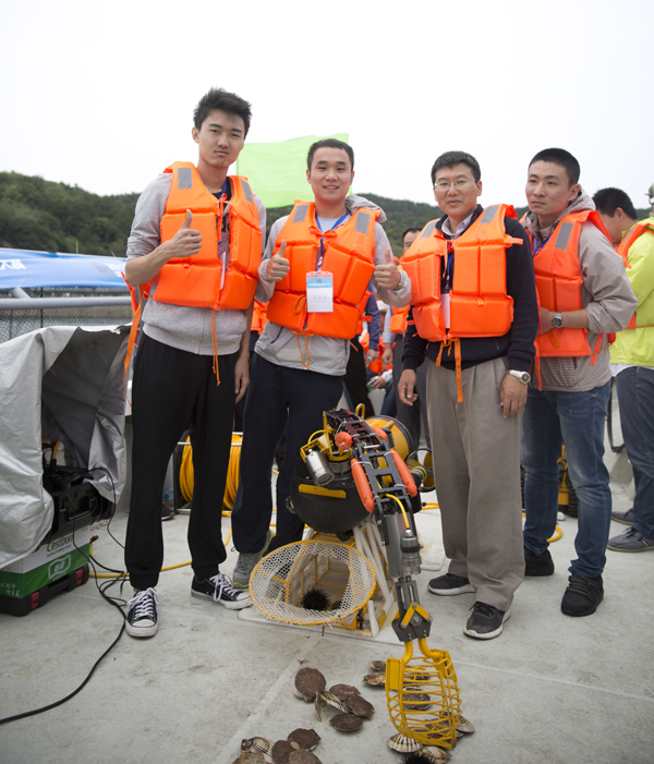 我校代表队在研究和分析了獐子岛附近海域水下情况的基础上,设计了一套适用于水下探测、水下作业、水产养殖作业等需求的机器人设备,可适用于高度危险环境下以及水下长时间作业等多种任务需求,最终获得定点抓取组二等奖。比赛中,该机器人的表现引起了专家、评审以及观赛者的阵阵欢呼和掌声。