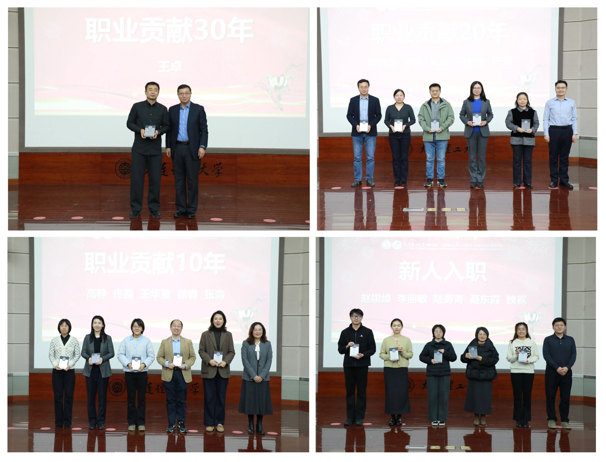 李成恩副校长和学院领导班子为新人入职及职业贡献10年、20年、30年的教工颁发纪念章。全体教职工合影留念。