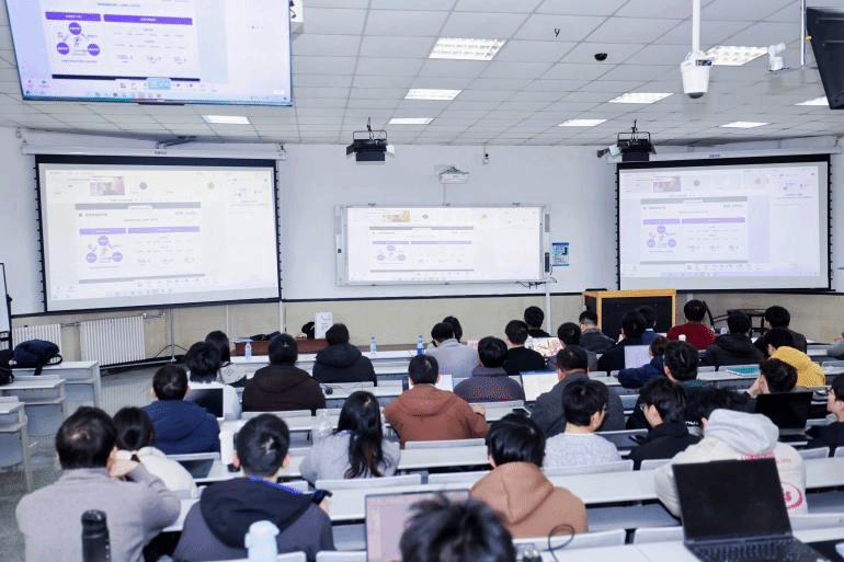 在技术分享环节,达摩院具身智能实验室技术专家薛盛可为在场师生带来了题为“迈向Physical AI新时代”的前沿技术分享。分享内容围绕四个部分展开:首先从具身智能的价值出发,阐述了物理世界与智能算法结合的重要意义;随后分析了当前行业趋势与挑战,指出具身智能在技术落地过程中面临的关键问题;接着重点介绍了乐云具身智能平台的技术架构与核心功能,展示了其在感知、决策与控制方面的创新实践;最后围绕生态合作建设,分享了达摩院在推动产学研协同创新方面的思考与探索。薛盛可的分享内容丰富、视野开阔,引发了在场师生的浓厚兴趣。