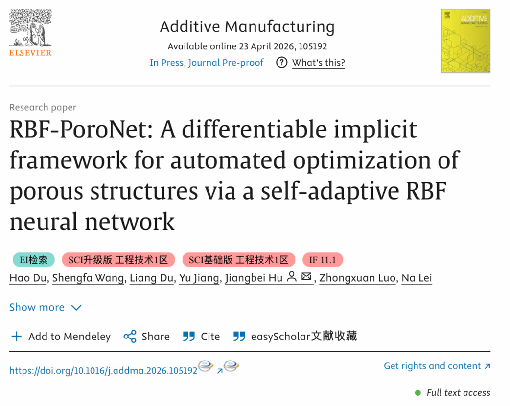 近日,我院智能网格与工业软件实验室在智能计算与先进结构设计交叉领域取得重要进展,发表多孔结构智能优化重要成果,以《RBF-PoroNet: A Differentiable Implicit Framework for Automated Optimization of Porous Structures via a Self-Adaptive RBF Neural Network》为题发表于增材制造领域国际顶级期刊Additive Manufacturing。Additive Manufacturing为增材制造领域国际公认顶级期刊(TOP 期刊,SCI 一区,JCR Q1,IF 11.1)。