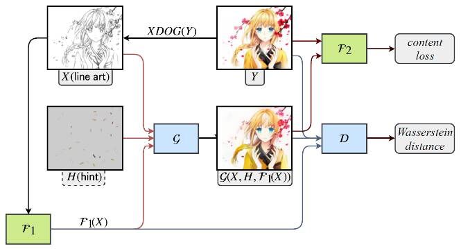 次元政发表的论文主要解决数字内容生成领域的用户引导线稿上色问题,即针对一幅线稿,提取其内在的语义信息,并依照用户的颜色提示和网络参数,对线稿进行语义级别上色。深入研究引导上色技术,对简化上色步骤、提高创作效率及减少中间帧上色工作量等都具有十分深远的意义。近年来,生成对抗网络模型在许多生成任务上都取得了巨大的成功,但是其可控性和过拟合问题仍然没有得到有效解决。论文提出了一种全新的基于局部特征网络和条件WGAN-GP的深度生成对抗模型框架,所设计的神经网络完全利用简单合成的数据进行训练并在真实数据上依然有很好性能,其性能明显优于传统的对抗网络算法和已有的商业化方法。