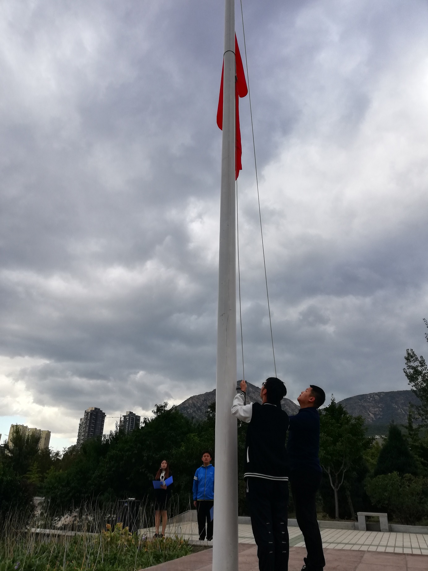 伴随着庄严的国歌,五星红旗徐徐升起,在晨风中飘扬。全体师生庄严肃立,深怀对党和祖国崇高的敬意,对革命先烈无尽的哀思,向国旗行注目礼。在激昂雄壮的国歌声中,每个人都立下了为实现中华民族伟大复兴而不懈努力的誓言。