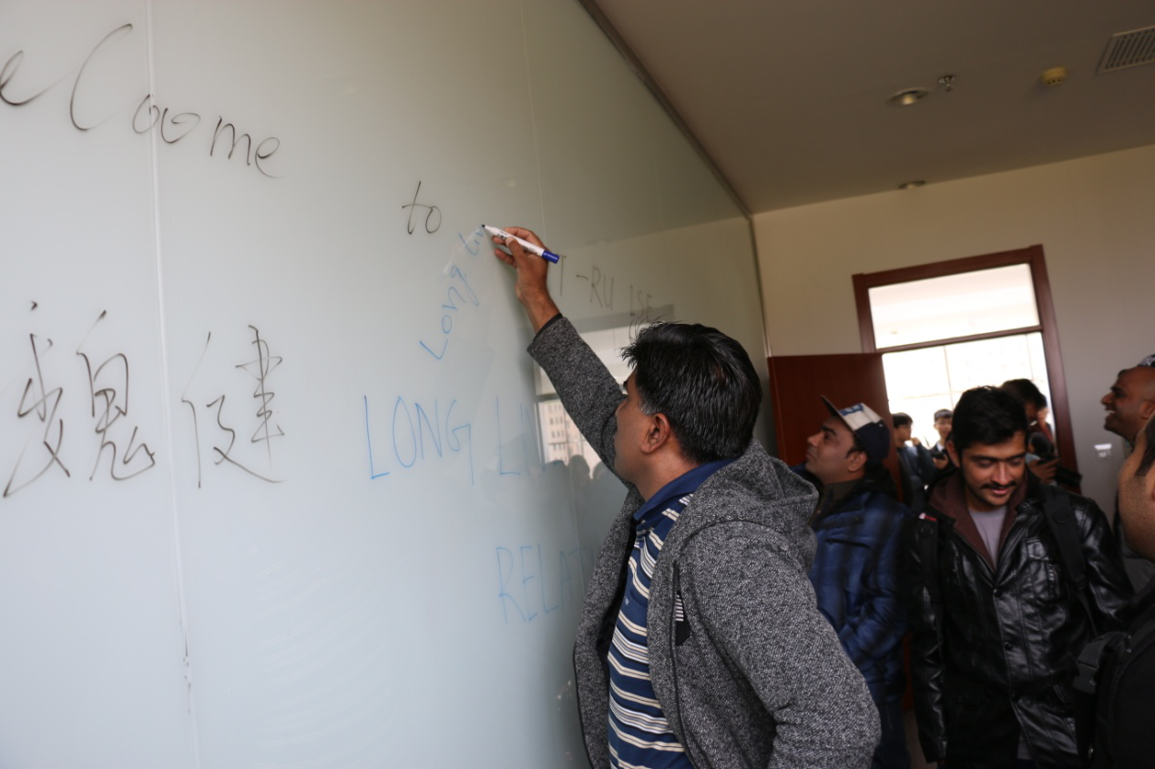 介绍完毕后,学生代表带领留学生们参观了我院的学生工作办公室,观看了大连理工大学宣传片,留学生们纷纷在办公室的玻璃幕墙写下自己的寄语,赞美中外友谊,以及对大连理工大学的美好祝愿。