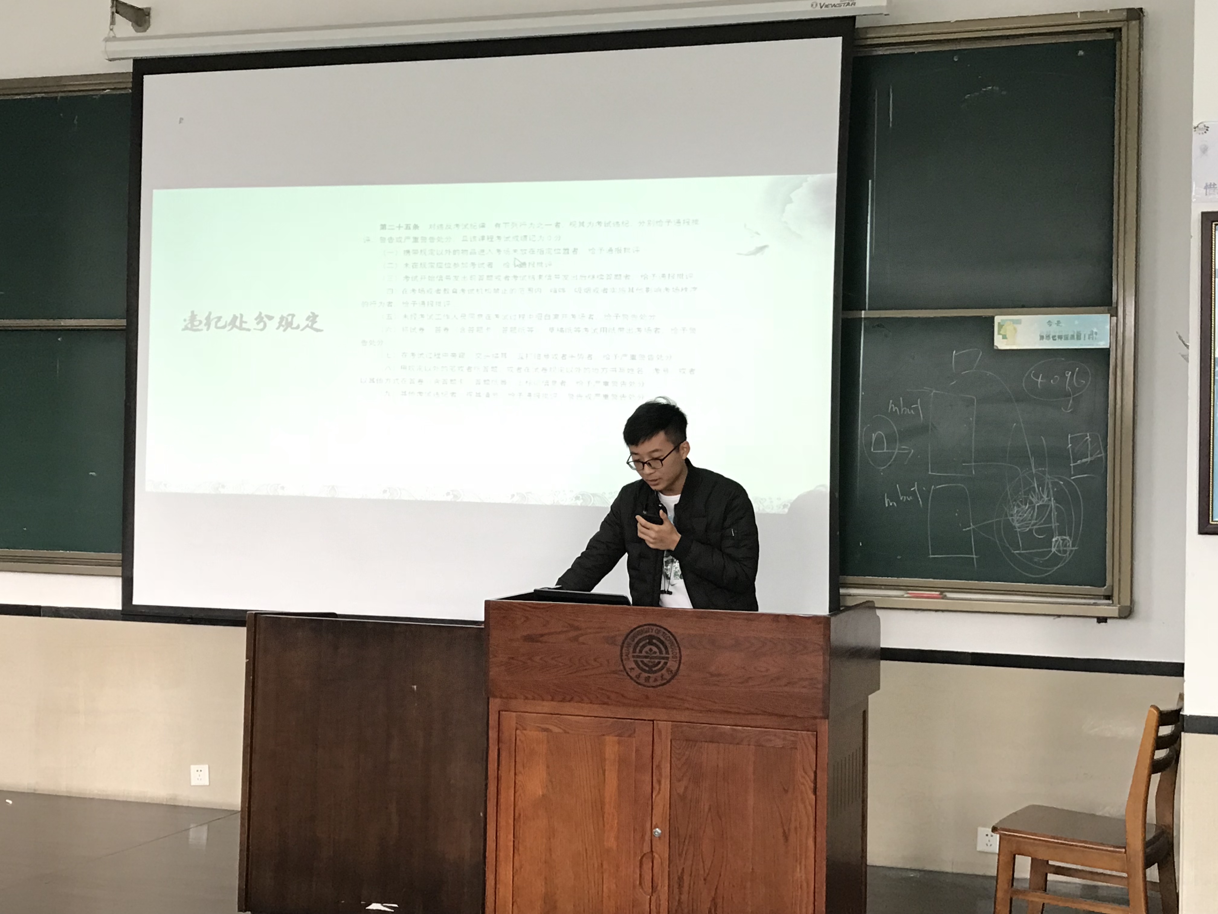 然后宣讲人学习部副部李博同学参照《大连理工大学学生手册》考场规则及违规违纪处分规定向同学们进行了详细的讲解,让同学们对考场规则有了明确的认识。