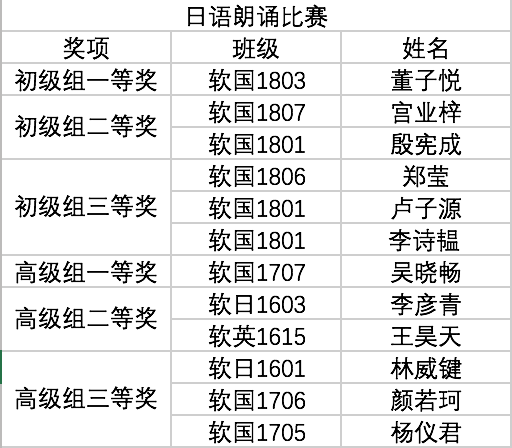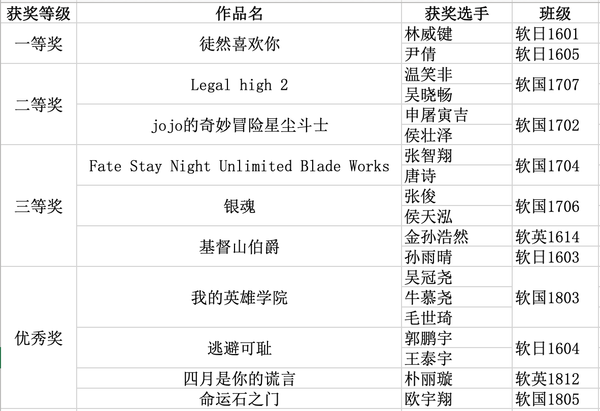 配音比赛最终决出一等奖一组、二等奖两组、三等奖三组、优秀奖四组。以下为获奖名单: