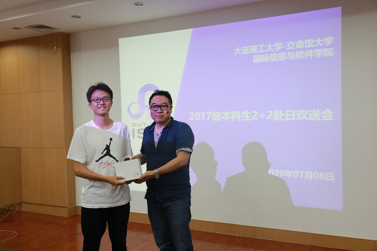 随后,国际信息与软件学院副院长林林教授为2+2赴日学习学生代表马闯同学授予学院定制纪念品并发表讲话。