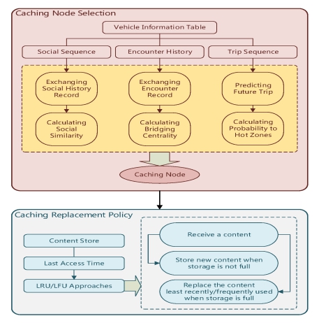 该论文由姚琳教授(国际信息与软件学院)、研究生王宇骐(软件学院)、王歆副教授(纽约州立大学石溪分校)等共同合作完成,是国际合作交流,跨领域团队合作的成果。论文针对车载网络数据安全存储问题,提出了一种基于节点社会属性和移动轨迹的协作式缓存机制。考虑到社会共同属性的人对相同内容感兴趣概率更大,因此内容分发给具有相似兴趣、更活跃的移动用户是一个较好的选择。采用Jaccard相似系数来计算社会相似度、用隐马尔可夫模型来预测车辆到达热区的概率,以此来对网络中的缓存节点进行筛选并提供安全的缓存服务(抵抗记录联动攻击、属性联动攻击、表联动攻击等)。