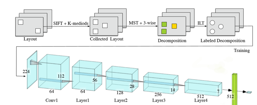 该研究由我院副教授仲维、研究生虎舒翔、本科生马秀媛与香港中文大学余备教授团队合作完成。工作针对双重曝光光刻过程中布局分解品质难以分析和选择的问题,通过利用深度学习能从大量数据自动构建映射关系的特点,指导生成高质量的布局分解结果。作者提出了应用组合测试的思想,设置不同的组合强度,从而使生成的候选分解分布在可能的最优解空间附近。同时,由于掩模优化过程十分耗时,相较于传统依靠掩模优化的贪心选择策略,通过网络直接评估候选分解优劣的方法不仅提升了选择准确度,更加速了整体优化过程。此外,作者还提出了基于特征的布局相似度衡量标准,并在此基础上通过k-mediods聚类的方式选择最有代表性的训练集从而提升训练效果。实验结果表明,该成果在优化效果和速度等各项指标方面有显著提升。