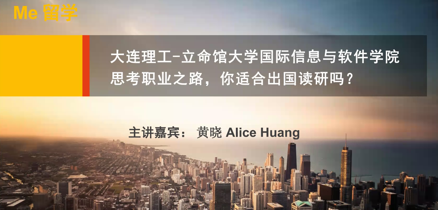 举国同心抗疫之际,国际信息与软件学院的同学们于3月29日晚7:30通过线上直播的方式,聆听了大工校友Alice老师带来的一场关于出国读研的回归讲座。