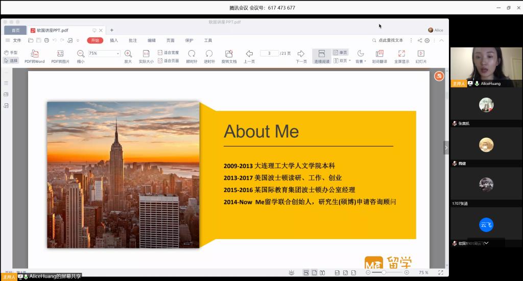Alice 老师是美国本土留学机构Me 留学联合创始人,本科毕业于大连理工大学传媒专业,硕士毕业于美国波士顿Emerson College整合营销传播专业。秉持“分享海外经历,倡导家国情怀”的理念,Alice老师给我们具体分析了主流留学国家的利弊,介绍了申请出国留学的流程事项,探讨了疫情时期对出国留学的是否存在影响等。