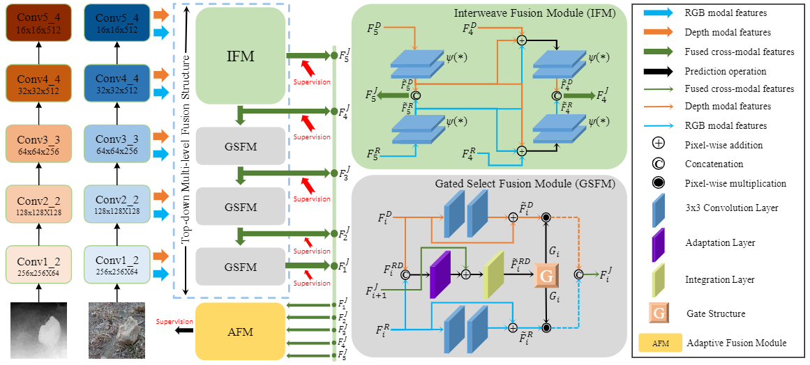 论文“Feature Reintegration over Differential Treatment: A Top-down and Adaptive Fusion Network for RGB-D Salient Object Detection” 由研究生张煜、胡蓓启、张淼副教授与信息与通信工程学院卢湖川教授团队合作完成。该项研究针对于RGB与Depth两种模态数据在基于深度学习的RGB-D显著性检测方法中网络的高层级与低层级贡献不同,提出了一种新的自顶向下的多层级融合结构,利用不同的融合策略来有效地挖掘低层和高层特征。在高层级,设计了一个有效的交织融合模块整合全局信息;在低层级,启发于门控机制,设计了有效的融合模块从RGB和Depth数据中过滤掉冗余的局部信息,从而有效地选择有用的局部信息。此外,在自顶向下的结构基础上,又设计出自适应融合模块来重新整合各层次的跨模态融合特征,以预测更准确的结果。在7个广泛使用的RGB-D数据集上进行的综合实验表明,该方法优于目前最先进的RGB-D显著性物体检测方法。