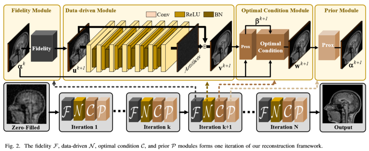 如图1所示,在基于最新深度学习方法的重构示例中,圈出的解剖结构错误地出现了伪像。因此,没有理论上的保证,医学研究和临床诊断都难以相信重建过程。面对以上挑战,该研究团队提出了具有收敛性理论保证的深度学习与传统优化相结合的求解框架。相关研究工作“A Theoretically Guaranteed Deep Optimization Framework for Robust Compressive Sensing MRI”,被CCF A类会议AAAI Conference on Artificial Intelligence (AAAI’19)录用。该研究团队进一步提出了通用的深度模块组装框架,以有效可靠地解决非凸和非光滑的CS-MRI模型。