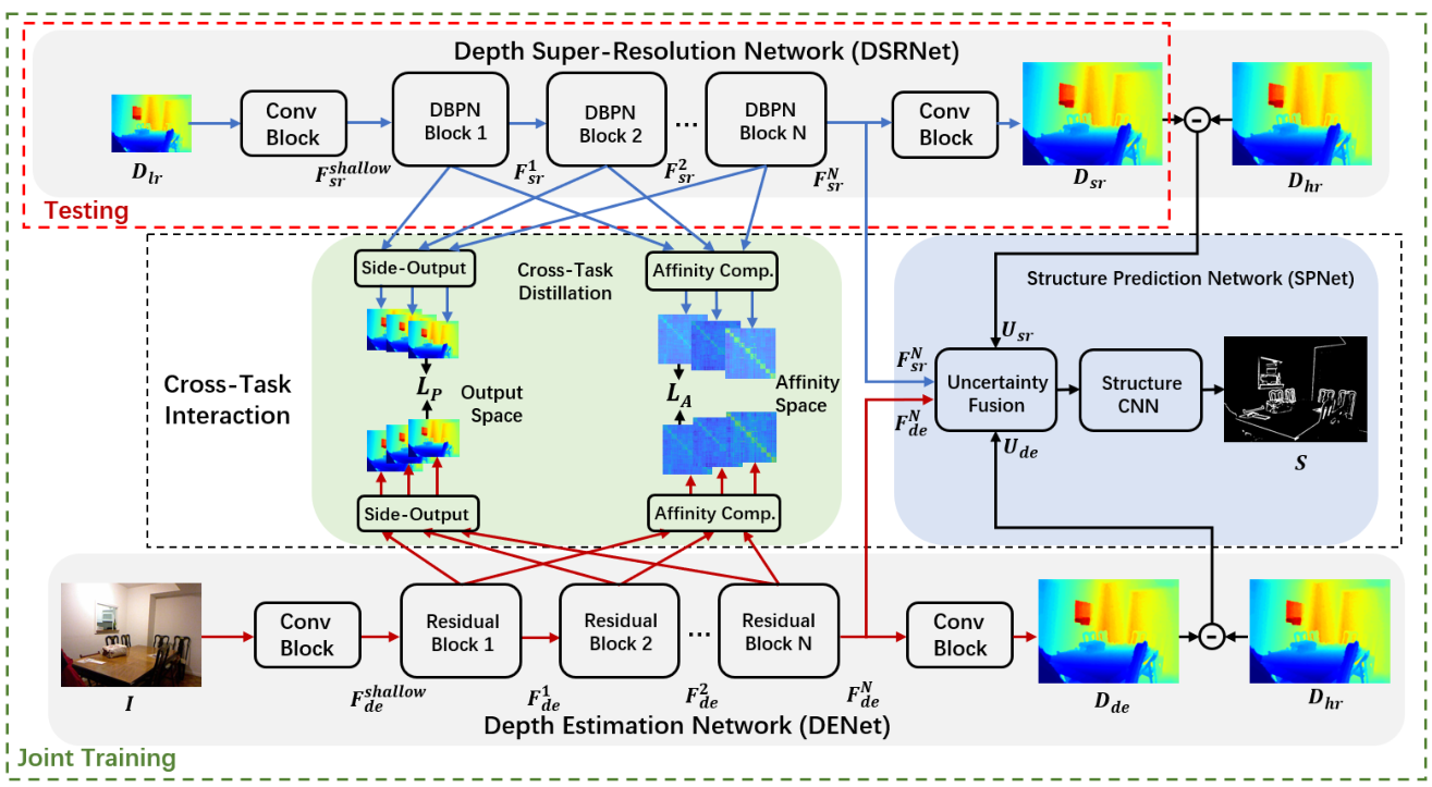 我院硕士研究生孙宝利、叶昕辰副教授、李豪杰教授、王智慧教授、徐睿副教授及百度研究院科学家Baopu Li共同合作完成的论文“Learning Scene Structure Guidance via Cross-Task Knowledge Transfer for Single Depth Super-Resolution”提出了基于跨任务知识迁移的深度图像复原方法,突破现有基于彩色指导的场景深度复原方法的局限性,即在训练及测试阶段同时需要高分辨率彩色图像和降质深度图像作为网络输入来估计高质量深度图像(在实际测试环境中,同视角的高分辨率彩色辅助信息并不容易获得),解决了深度传感系统获取的场景深度图像分辨率低和细节丢失等问题。该项研究通过在训练阶段从彩色图像蒸馏出场景结构信息来辅助提升深度复原性能,而测试阶段仅提供单张降质深度图像作为输入即可实现深度图像重建。该算法框架同时构造了深度估计任务(彩色图像为输入估计深度信息)及深度复原任务(低质量深度为输入估计高质量深度),并提出了基于师生角色交换的跨任务知识蒸馏策略以及不确定度引导的结构正则化学习来实现双边知识迁移,通过协同训练两个任务来提升深度复原任务的性能。大量的实验表明,在实际部署和测试中,该方法模型更轻量,算法速度更快,且在缺少高分辨率彩色信息辅助的情况下可以获得更优的性能。