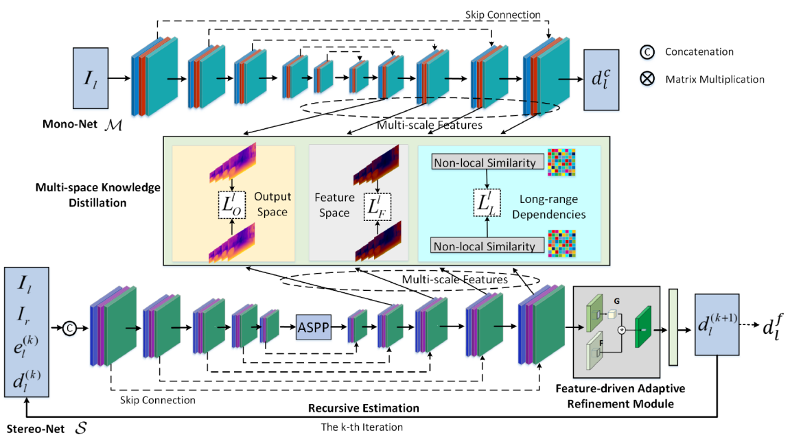 网络模型的设计关键问题在于如何提升教师网络的自身能力(teacher’s own ability)和其“教学”的能力(teaching ability)。针对于前者,本成果提出了基于递归迭代及特征驱动自适应精细化的方法来提升立体网络的性能;针对于后者,本成果提出了一种多尺度多空间的知识蒸馏机制,从图像空间、特征空间以及远距离相关性(long-range dependencies)三个方面提取立体网络的知识用于提升单目网络的深度估计性能。