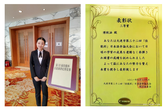 9月29日,我院2019级博秋涵同学经过激烈的角逐脱颖而出,获得大连市第32届“佳能杯”日语演讲比赛大学非专业组三等奖。这是我院同学连续第二年在“佳能杯”日语演讲比赛上获奖。