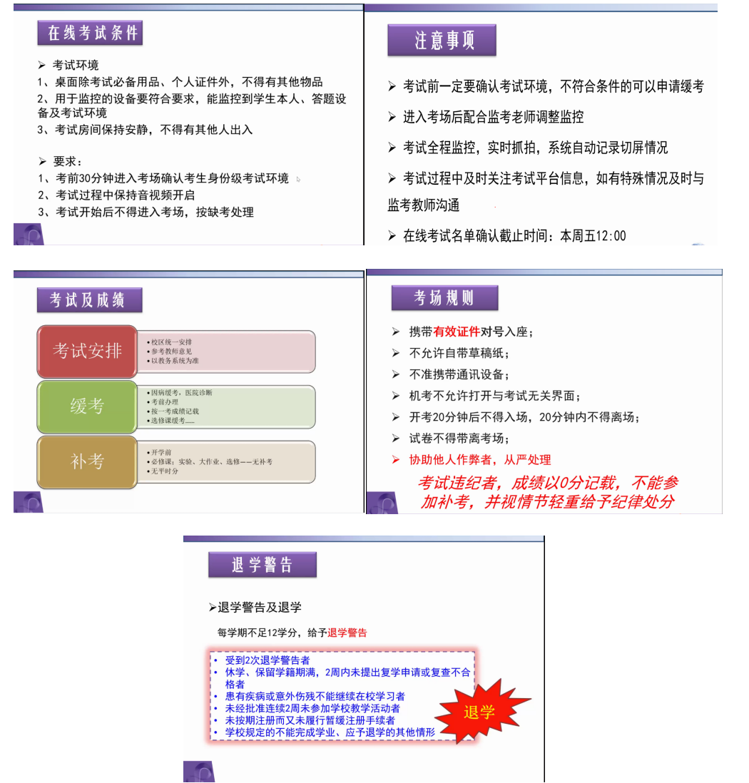 会上,教务员韩涛围绕在线考试要求及注意事项、考试及成绩、考场规则及退学警告等内容为学生做细致讲解。她表示考生需考前做好准备工作,考试时严格按照考场要求执行,听从监考老师安排。她强调协助他人作弊者,将会从严处理;考试旷考和违纪者,成绩为0分,不可参加补考,并视情节轻重给予纪律处分。另外,她分别讲解了学校考试安排、补缓考要求、给予退学警告及退学的相关情况,提醒学生应以教务系统为准及时关注考试安排,合理申请并进行补缓考,避免出现给予退学警告及退学的情况,影响学业。