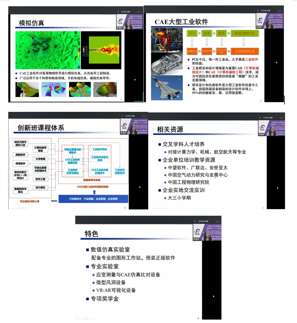 雷娜教授从什么是CAE大型工业软件出发,通过可视化动画为大家讲解CAE大型工业软件的模拟仿真应用,详细介绍了特色班课程体系、教学团队、学科及企业教学资源、软硬件条件配备等内容,加深了同学们对CAE大型工业软件的了解。