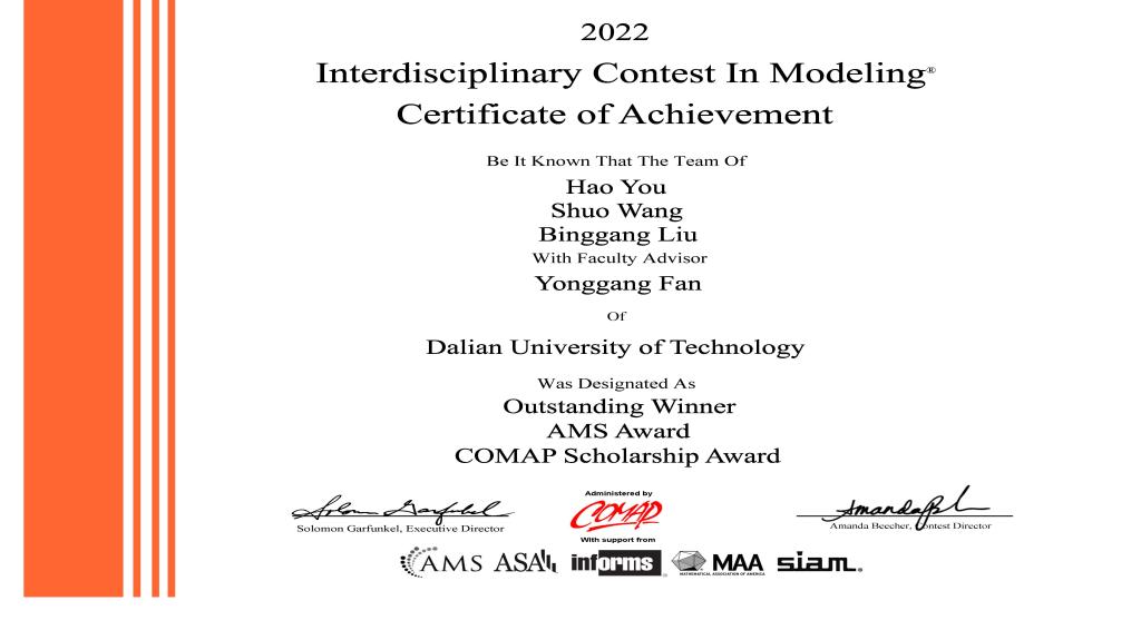 由我院2020级本科生尤好、软件学院王硕、化工学院刘炳纲组成的团队(指导老师:范永刚),斩获大赛最高奖项--特等奖(Outstanding Winner)。团队同时获得AMS奖(美国数学学会冠名奖,每年仅有六支队伍获此奖项)和COMAP奖学金(每年仅有四支队伍获此奖项)。该团队创造我校数模美赛的最好成绩!