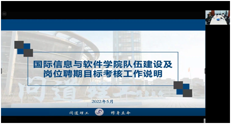 5月25日,国际信息与软件学院在线召开全院教师大会,就师资队伍建设及教师聘期目标考核与全体教师进行交流。校长助理、开发区校区党工委书记、管委会主任罗钟铉出席会议,院长樊鑫队就师资伍建设和目标考核工作进行了说明和交流,党总支书记雷娜对相关工作进行了强调和要求。会议由学院党总支副书记、副院长辛永亮主持。