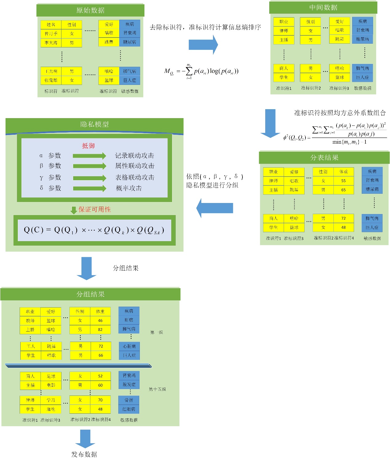 该篇论文由姚琳教授(国际信息与软件学院)、研究生陈振宇(软件学院)、王歆副教授(纽约州立大学石溪分校)等共同合作完成。这是国际合作交流,跨领域团队合作的成果。针对数据发布(Data Publishing)中的隐私问题(包括记录联动攻击Record Linkage Attack、属性联动攻击Attribute Linkage Attack、表联动攻击Table Linkage Attack、概率攻击Probabilistic attack),论文提出一种基于Anatomization的隐私保护方案。通过信息熵来衡量各类属性信息量,使用均方意外系数来衡量属性之间相关性,以信息量为基础,相关性为辅助,利用Anatomization的思想对于属性进行分表,解构属性之间的相关性来保护隐私。同时,论文中又提出一种满足收敛性条件的分组方法,基于这种分组方法,能够在满足隐私要求的同时提高数据的可用性。