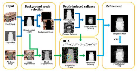 论文“Saliency Detection via Depth-induced Cellular Automata on Light Field”由研究生李啸、荣政坤、张淼副教授等共同完成。该项研究通过构建对象导向深度图作为诱导器,有效地整合光场线索之间的关系,同时通过构建深度引导的元胞自动机(DCA)优化模型,利用其相似区域的内在相关性来更新每个超像素的显著性值。所提出的方法利用深度、位置、焦点和颜色线索对细胞邻域进行定义并跟新其标准。此方法在挑战性场景中展现了优异的性能。