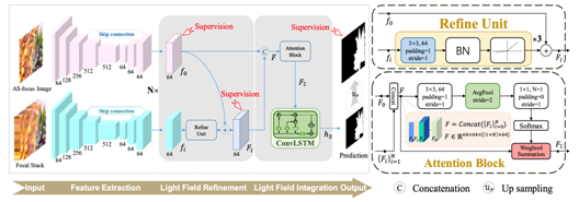 论文“LFNet: Light Field Fusion Network forSalient Object Detection”由研究生冀炜、李婧婧、张淼副教授等共同完成的研究成果。该项研究创新性的设计了一个充分利用光场信息的融合网络,其利用4D光场数据包含丰富的空间和上下文信息。LFNet的主要贡献由一个光场细化模块(LFRM)和一个光场集成模块(LFIM)组成,来实现光场图像的聚焦、深度和客观线索的细化和集成。LFRM学习光场和RGB图像之间的光场残差,利用有用的光场线索细化特征,然后LFIM对每个细化的光场特征进行加权,学习它们之间的空间相关性,从而预测显著性图。此方法可以充分利用光场信息,尤其是在复杂的场景中也能获得优异的性能。
